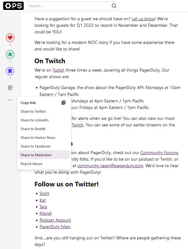 - the PagerDuty Team are still busy as ever (when do they sleep?!) and would love to hear from you: Where are you hanging out online while Twitter is fraying at the seams?