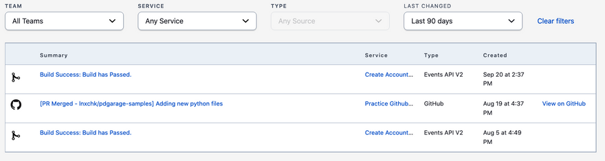 Change events are informational events only - they won’t become an alert or incident on your PagerDuty service. They provide context for any changes that might be coming into the services your team runs and manages with PagerDuty.