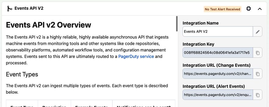 Setting up a service to receive change events is similar to alerting events as well! In the Integrations tab of the service, you can add an integration, and choose Events API V2 as the integration type. The integration_key in the configuration can be used to send both alerting events and change events, simply by using the separate API endpoints: