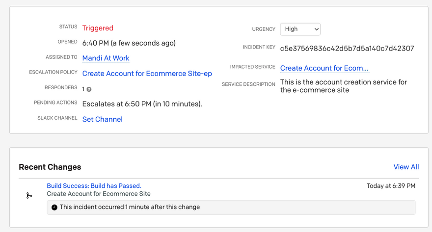 Where change events can really save your team time is when your service is experiencing an incident. Change events will appear in PagerDuty on the main page for your service, so you can see what’s been going on recently: