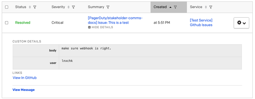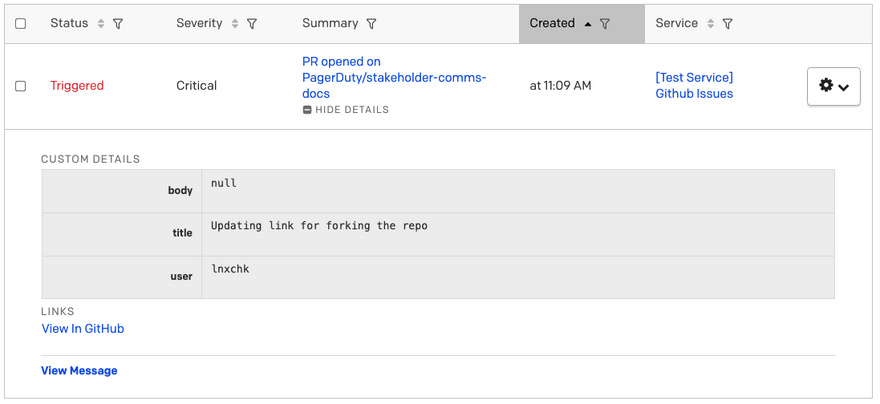 I’ve changed the incidentSummary slightly from the issues section, just as an example. I’ve added the title, body, and user to the custom details so they’ll show up in the information table in the incident. The body of this PR is empty, so it shows up as “null” in my alert:
