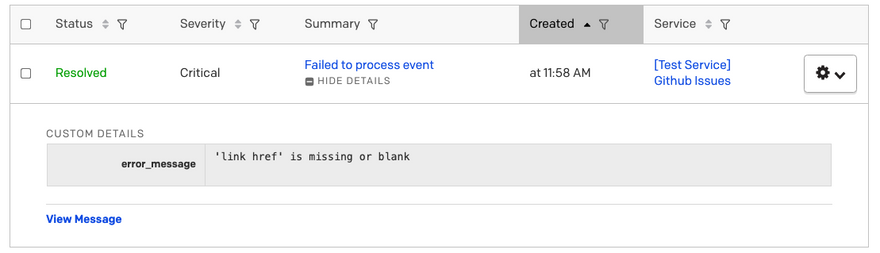 When my event is delivered to PagerDuty, I’ll have a nice table of information, and if I want to add more pieces later, it’s easy to add them to customDetails: