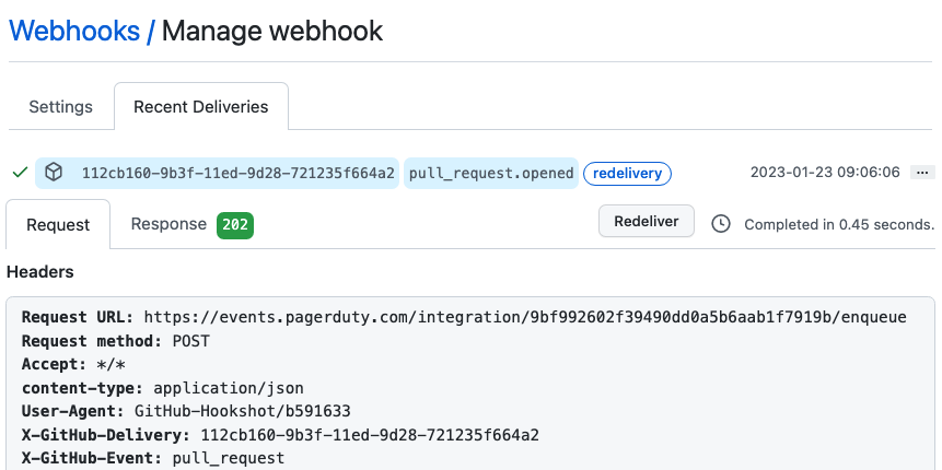 You’ll see the rest of the webhook, including headers, below the redeliver button. This is super useful for figuring out which parts of the payload you’d like to use in your alert. You can scroll through the attributes of the payload and choose the pieces that make the most sense for how your team works and manages incidents.