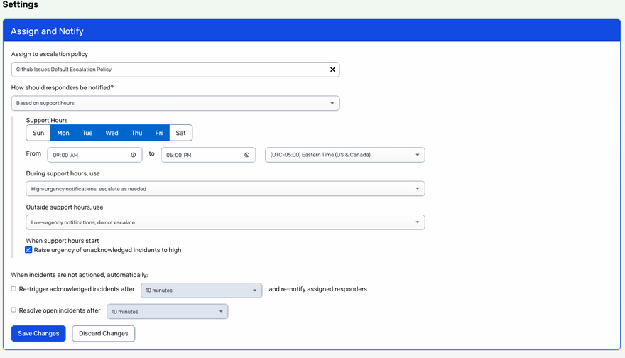 I could also use the support hours setting for the service that will receive the alerts. I can define a limited window in which these alerts will generate notifications to the team: