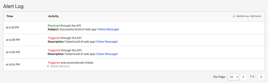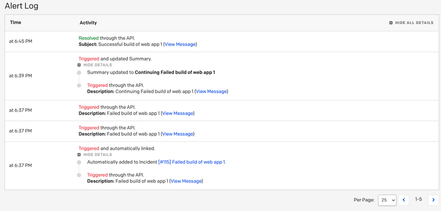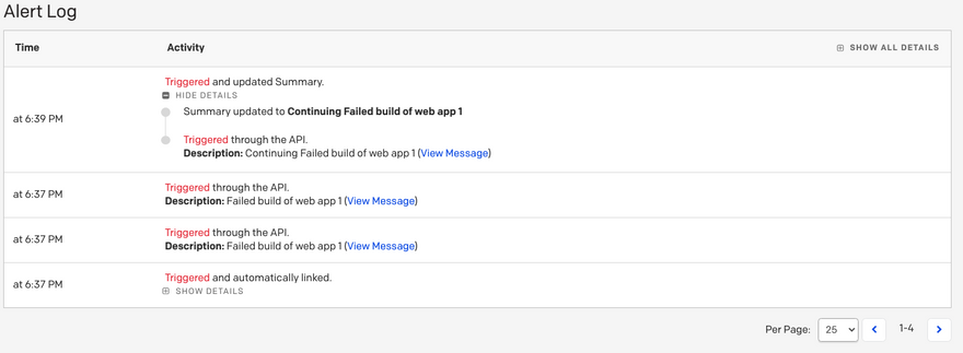 Any additional alerts sent to the same service with the trigger action and the dedup_key set to web-build-app-1 will be grouped together in the same incident. If the data changes between events, the alert will also update. In this example, the event has a new summary.