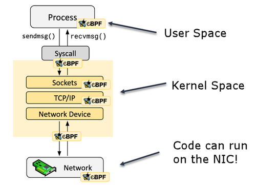 So, think of it as a lightweight, fully-sandboxed virtual machine (VM) inside the Linux kernel. eBPF programs are event based, and are executed on a specific hook, such as network events, system calls, function entries, and kernel trace points.
