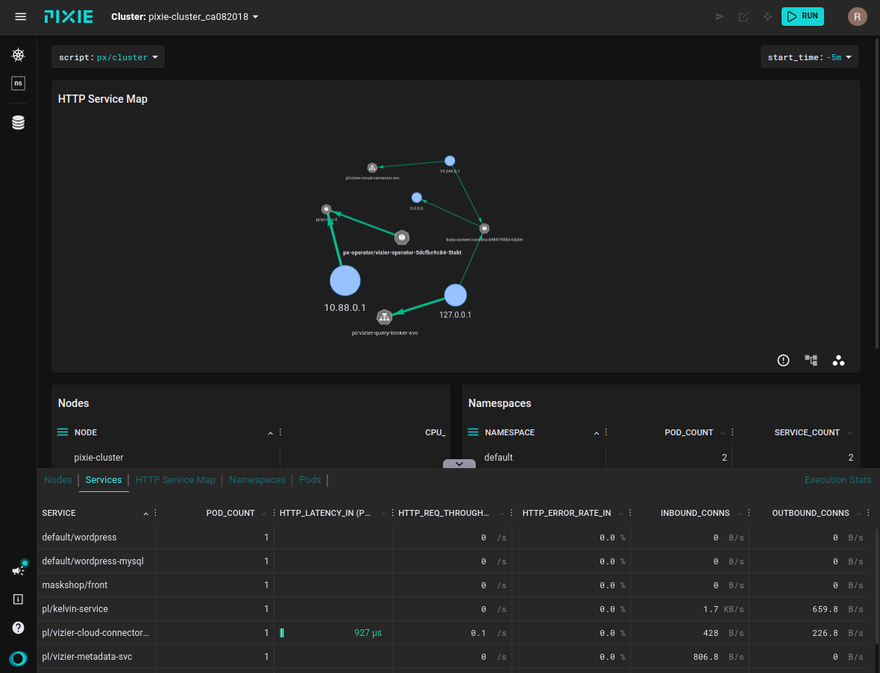 Pixie is an open source (3.4k⭐) observability platform built by New Relic. It is very convenient to use Pixie to view the high-level state of your cluster (service maps, cluster resources, application traffic) and also drill down into more detailed views (pod state, flame graphs, individual full-body application requests).