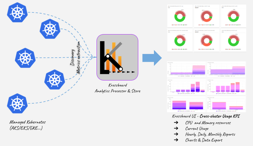This article introduces a concept and a tool to address the use case to get a comprehensive visualization to analyse and understand resource usage on environments with many Kubernetes clusters. Our approach is specifically tailored for managed Kubernetes platforms aiming at helping organizations to easily make cost allocation and capacity planning decisions. Beyond concepts, the result of this work is an application called Krossboard that will be demonstrated later in this article. In a nutshell, Krossboard is a software stack that implements a centralized cross-cluster usage analytics approach atop of Amazon EKS, Microsoft AKS and Google GKE.