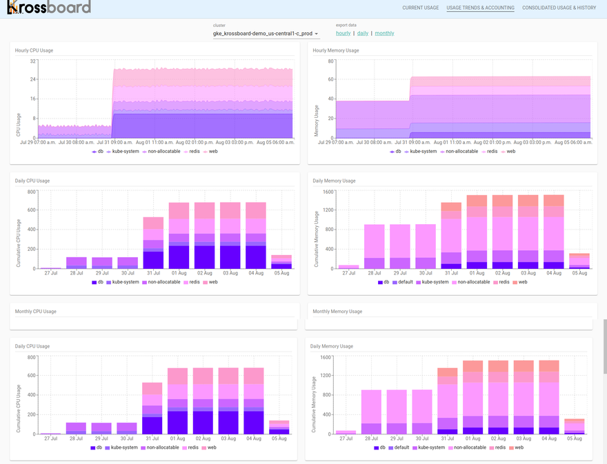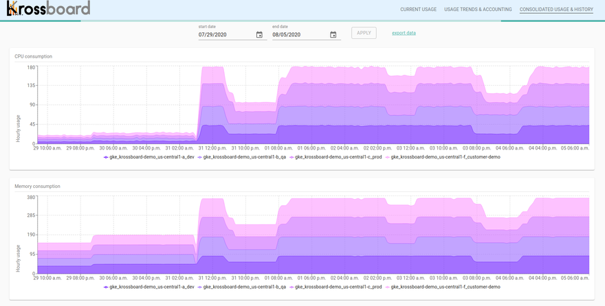 • Consistent analytics — for each cluster, Krossboard computes resource usage for each individual namespace and aggregates them on an hourly basis (what we consider as a consistent and relevant cost allocation time unit). The resulting analytics are rendered with various perspectives that cover days, months, and up to a year.