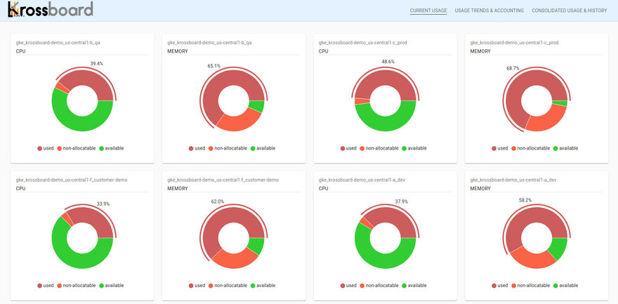 Krossboard — sample of screenshot showing 5-minutes recent CPU and Memory usage per GKE clusterKrossboard — sample of screenshot showing 5-minutes recent CPU and Memory usage per GKE cluster