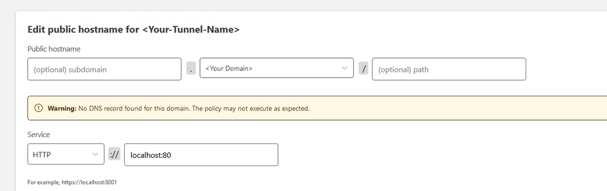 If you are aiming to use the tunnel for a domain on the apex of your site (not on a subdomain), you will need to create a duplicate public hostname, but with the www subdomain, or your www subdomain will not work and potentially confuse visitors or other sources that assume www will always work.