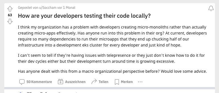 Our dev teams have been using k3d (or other local Kubernetes provider) plus Telepresence 2 for quite some time. However, while Telepresence is a pretty cool tool, we must admit that we had quite a few troubles with it in the past.