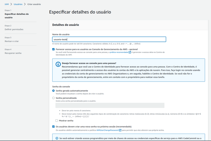 Para permitir o acesso ao console de gerenciamento é necessário criar a senha no momento da criação do usuário, seja ela gerada automaticamente ou atribuir uma senha personalizada:
