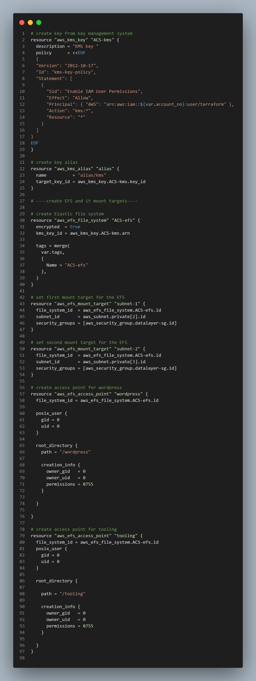 efs.tffile: In order to create an EFS you need to create a KMS key.Add the following code to
