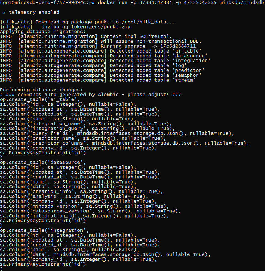 Step 4: We will now run a command to run MindsDB on our instance and expose specific ports so that we can access its GUI and MySQL APIs, etc. Use the command below to do it.