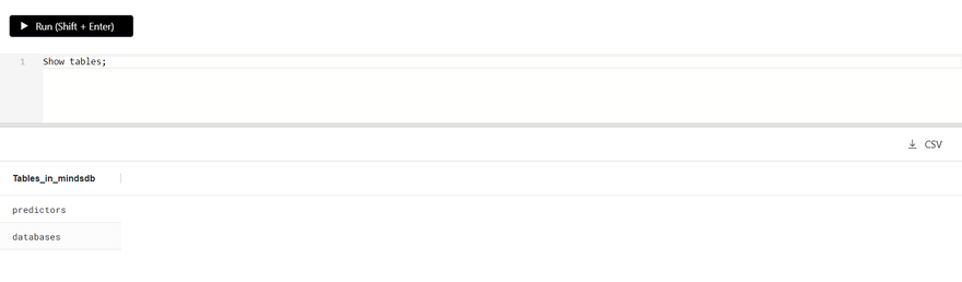 As we have already hosted our MindsDB version on the instance, we are now ready to train the predictor models and start predicting results as we require. But let us first explore the tables that are present by default. We can simply do that with the following command.