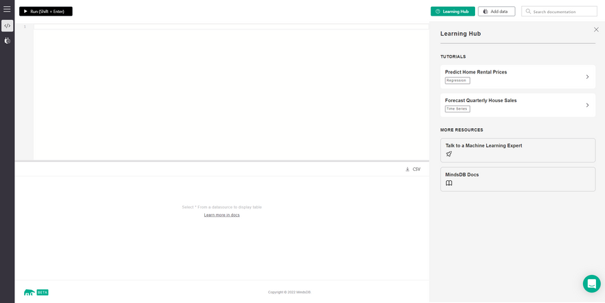 Step 5: We can now simply try to access the MindsDB GUI using the Public IP of the instance over the exposed port of 47334. If we give a closer look at the interface, we can find a query writer at the top, the result viewer at the bottom and the learning hub resources towards the right.