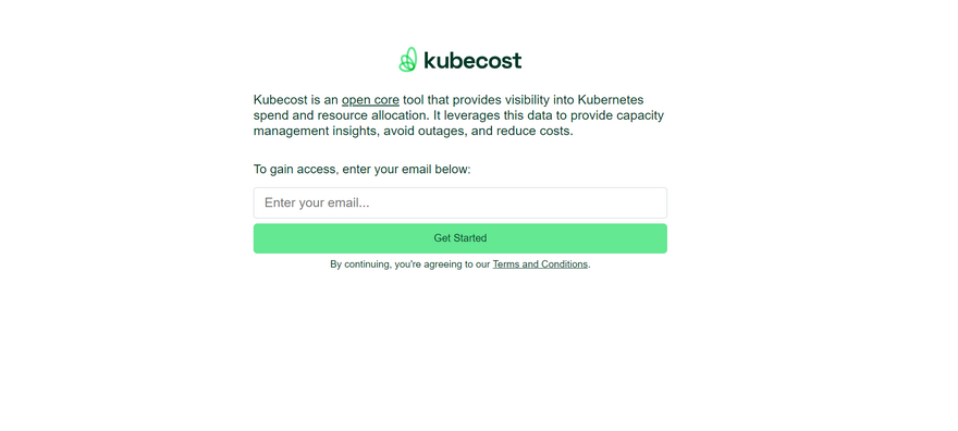Step 1: Navigate to the Kubecost install page and provide your email and click Get Started. This will take you to the instructions page and a unique kubecostToken will be generated for you.