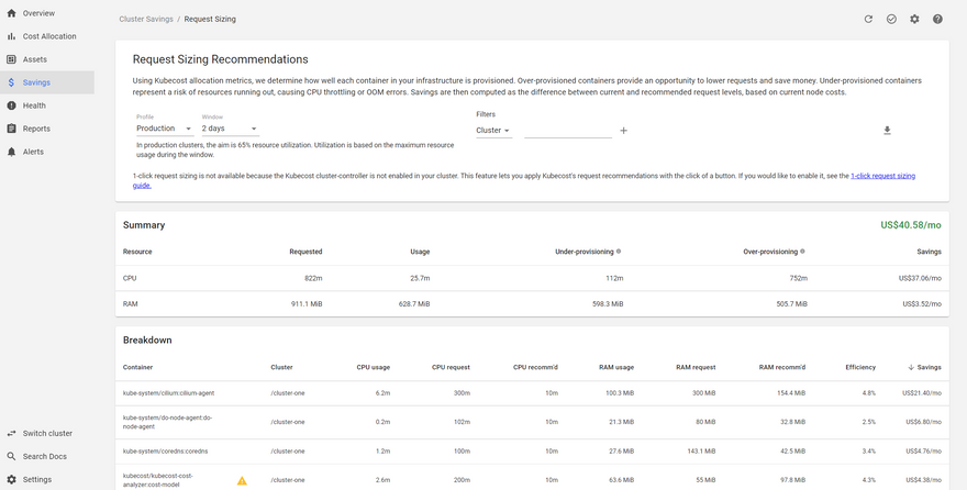 In addition to all those things related to cost, Kubecost also has its in-built metrics to determine the overall cluster health score based on infrastructure reliability and performance risks.