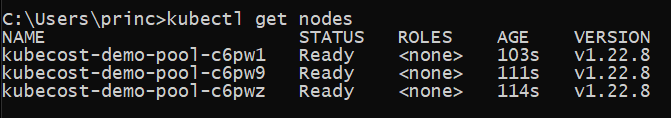 kubectl --kubeconfig=~/<pathtodirectory>/kubecost-demo-kubeconfig.yaml" get nodes