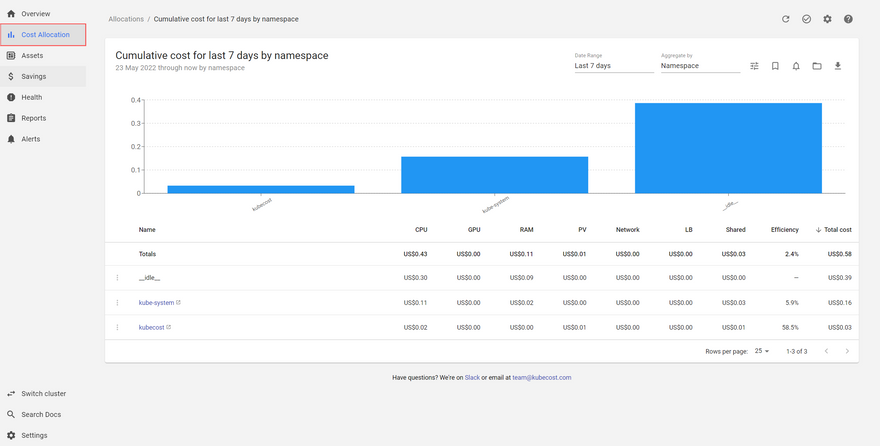 This section shows the cumulative cost allocation/utilization for the last 7 days for each namespace in the cluster. The table provides a clearer picture of what configuration of resources are being consumed by that namespace and how much cost it incurs.