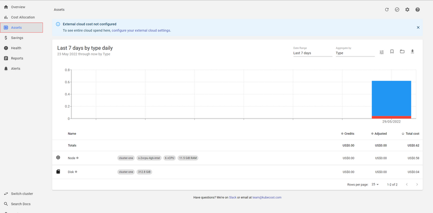 This section lists out the assets utilized and the total cost incurred in the last 7 days filtered by daily.