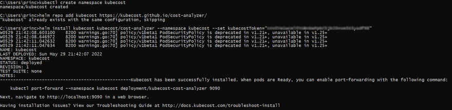 helm install kubecost kubecost/cost-analyzer --namespace kubecost --set kubecostToken="YourKubecostTokenHere"