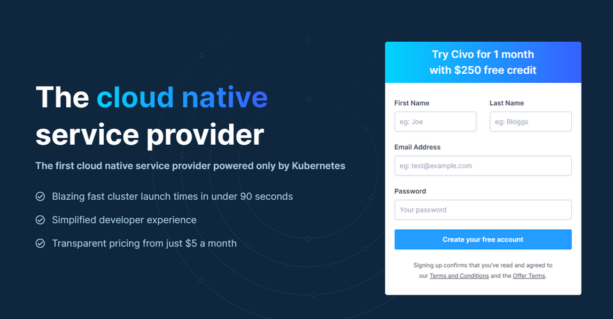 Step 1: Signup for a Civo account if you don't have one yet. They offer 250$ worth of free credits for a month to try their platform.