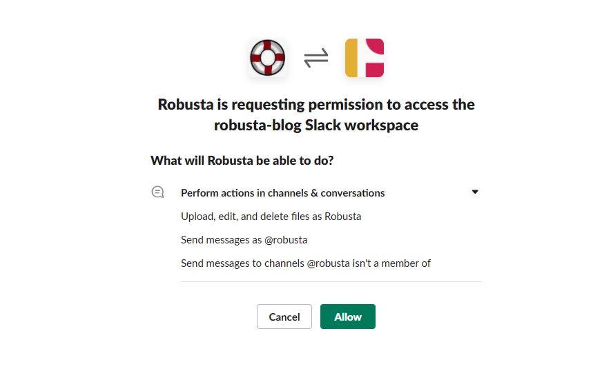 When you hit Y for the Slack integration (recommended), it opens a new tab in the browser where you can authorize Robusta to integrate into your workspace.
