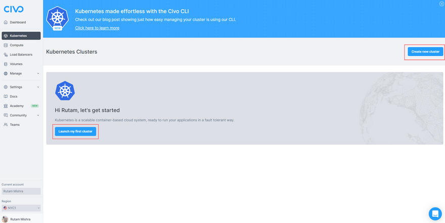 Step 2: Once you are logged in, make sure Kubernetes is selected in the left navigation pane and then click on Create new cluster or Launch my first cluster to open the cluster configuration dashboard.