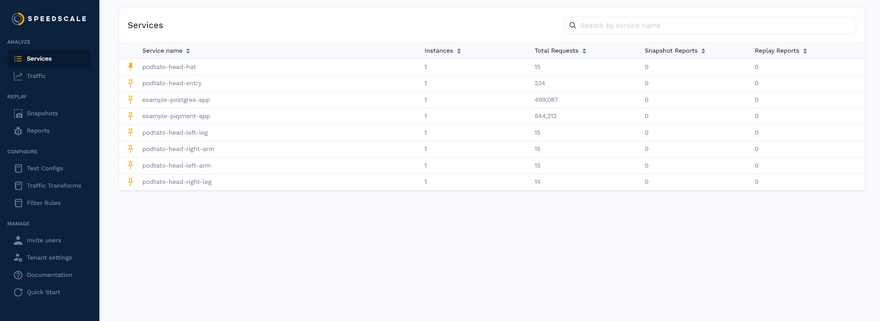 Step 2: After a while, we can see that our Podtato app services get enlisted in the Speedscale Dashboard. This ensures that the sidecars are successfully capturing the traffic logs.