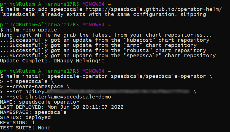 Step 3: For now, we will use the helm chart to install the Speedscale operator on our cluster.
