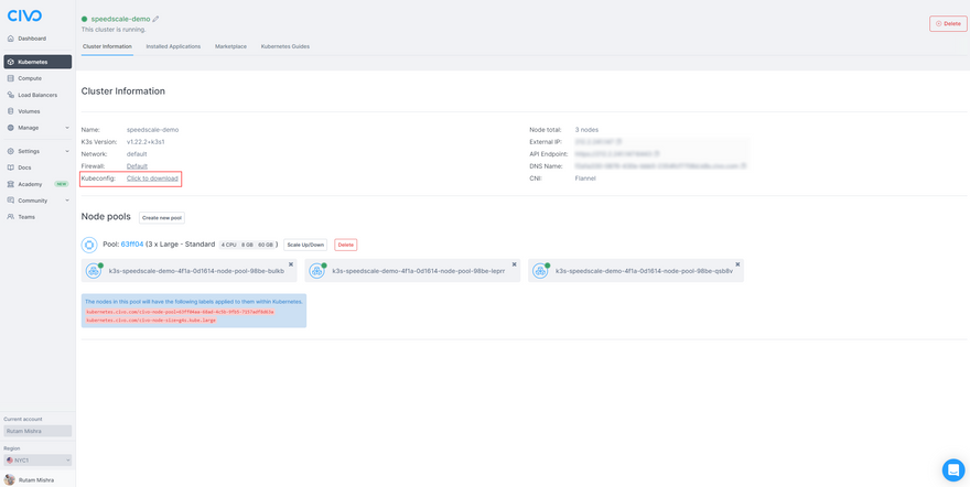 Step 4: Once the cluster is ready, simply download the kubeconfig and merge it in the config file in the .kube folder on your local system or you can simply overwrite it as well.