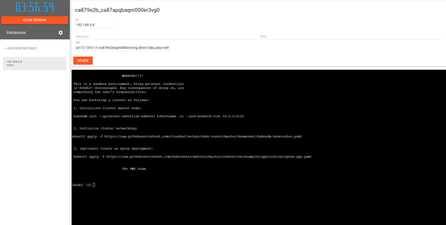 Play with Kubernetes is powered by Docker. You can simply log in with your Github or Docker credentials and start working with your instances. Each session in the playground stays for 4 hours. So, you have 4 hours per session to try out everything you want. But don't worry, once your session is consumed, you can always go ahead and start another new session and you will have 4 hours again to do something new.