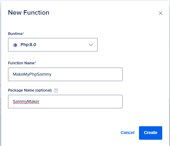 Step 1: Click on the New Function button in the Source tab, select Php:8.0 as the runtime this time, fill in the name and package as you want and click on Create.