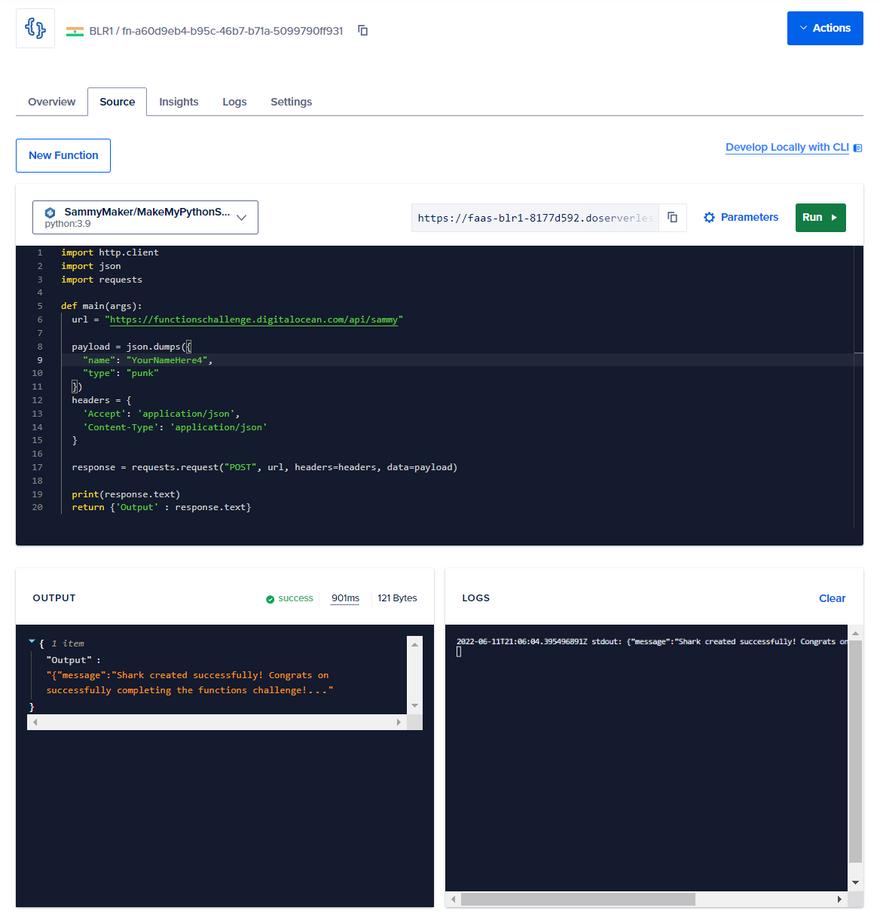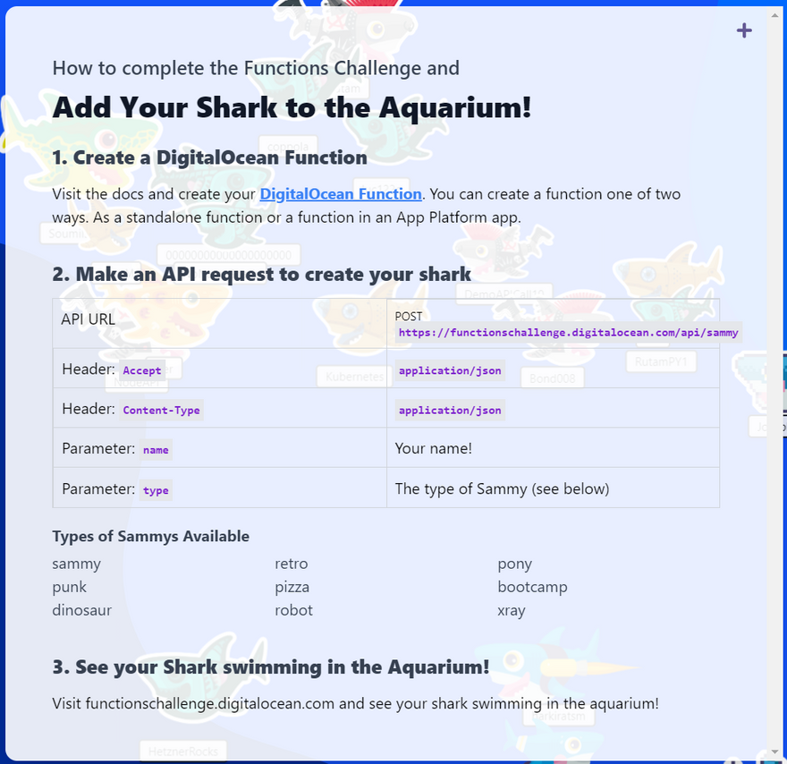 DigitalOcean is always community-driven and widely wants its community to try the new features and provide suggestions for the further scope of improvements. So, they have come up with a brand-new Functions challenge where one needs to call a Serverless Function to deploy Sammy, the official DigitalOcean mascot, in the shark tank created for this challenge.