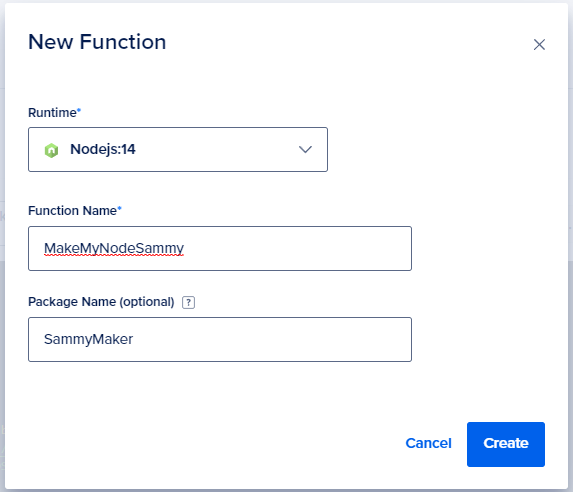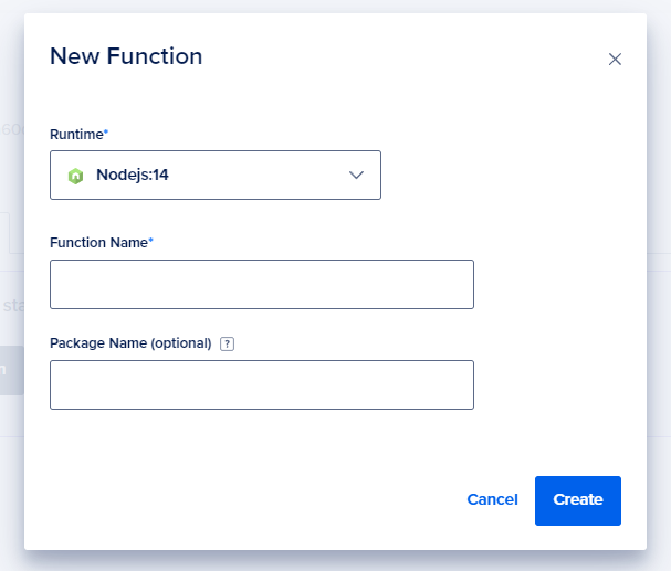 This opens a New Function dialog box where we need to select the Runtime, Function Name and Package Name (optional).