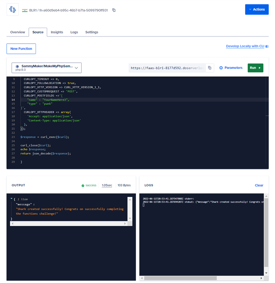 Step 3: As we have already done before, let's replace the YourNameHere and SammyTypeHere placeholders with the values we want, click on Save and then Run the function. This creates the Sammy as we specified and we have done this using the Php:8.0 runtime.