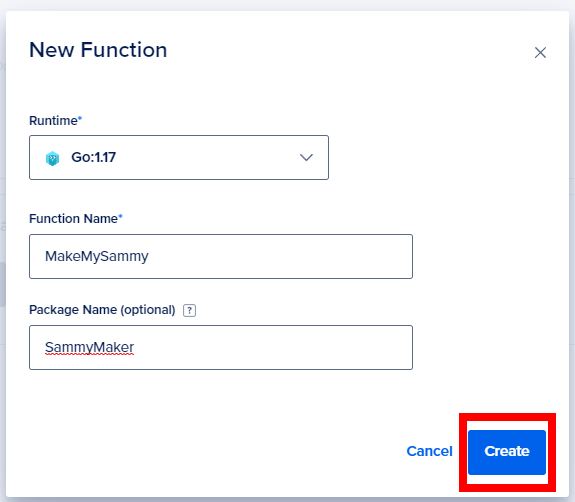 Step 1: After you click on New Function, in the New Function dialog box, select Go:1.17 as the runtime, give a name as you want and then a package name if you wish to and finally hit the Create button.