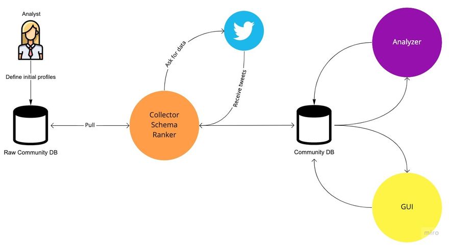 - Collection. The three collectors search each new profile added to the community in parallel. If any more data source/social network is needed - it's been developed on the side, and once ready, start listening for incoming events. Allows infinite scale of sources, ability to work on the specific source without disrupting the others, micro-scaling for better performance of each source individually, and more.