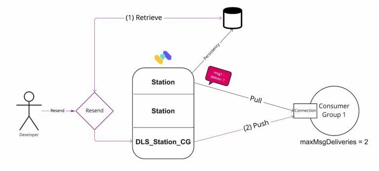 The unacknowledged message will be retrieved from Memphis internal DB, ingested into a dedicated station per station, per CG, and only upon request. Next, it will be pushed to the unacknowledged CG - WITHOUT ANY CODE CHANGE, using the same already-configured emit.