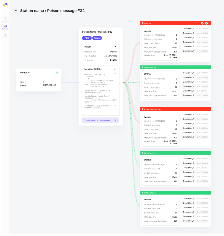 Instead of going around through logs and multiple consumer groups, we wanted to narrow the finding to the minimum, so a simple click on the “real-time tracing” will lead to a graph screen showing the CGs which passed the redelivery threshold.