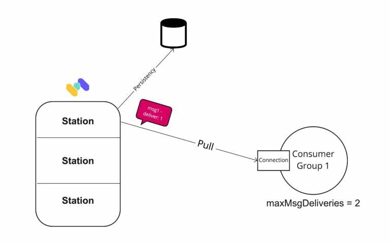 - Memphis broker senses the event of crossing the “maxMsgDeliveries = 2” per station, per consumer group.