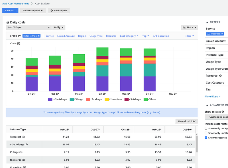 For example, to see the cost detail by the EC2-Instance Type — in the Group by choose the Instance Type, and in the Filters choose the EC2-Instances: