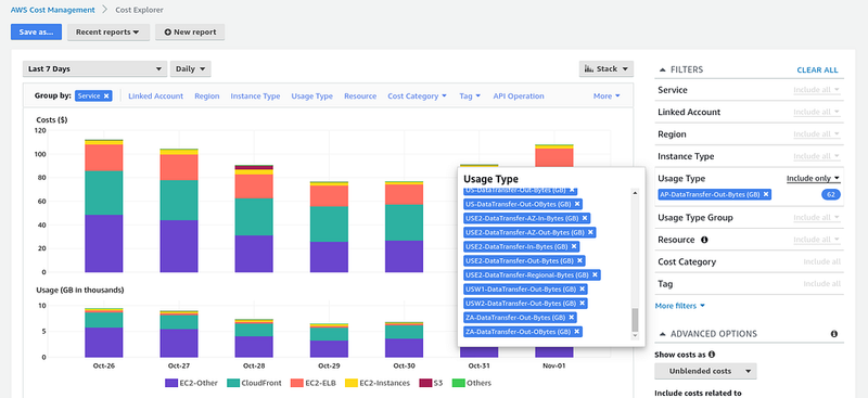 Now that we’ve touched on Data Transfer, let’s see how we can use Cost Explorer to check how much we pay for traffic, and for what exactly.