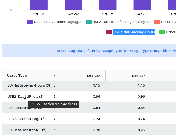 Let’s see. Select EC2-Other in Filters: and Usage type in Group by :