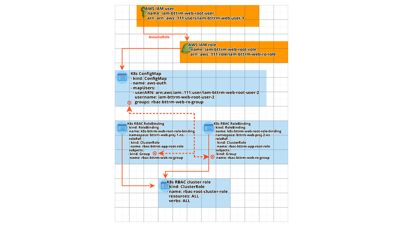 There our aws-auth ConfigMap will "map" our IAM Role to an RBAC group in the cluster, and our users will configure their AWS CLI to execute the AssumeRole of the actual Role arn:aws:iam::534***385:role/iam-bttrm-web-ro-role - then Kubernetes will receive an identifier common to both of there users, and they will be able to perform operations defined in their common RBAC Role and only in the allowed namespaces.