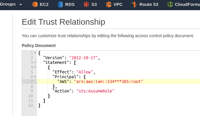 Switch to the Trust relationships tab, click Edit trust relationship, in Principal specify “AWS”: “arn:aws:iam::534***385:root” — here root includes all users (or rather, all authentication objects) of our account: