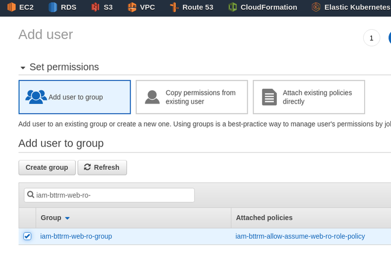 Go to Groups, create a new one, name it iam-bttrm-web-ro-group, connect the previously created Policy to it:
