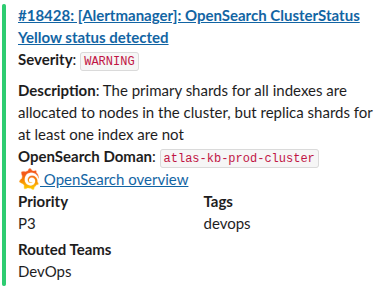 Through labels, we have implemented alert routing in Opsgenie to the necessary Slack channels, and the annotation grafana_opensearch_overview_url is used to add a link to Grafana in a Slack message: